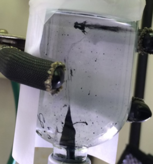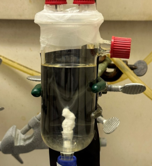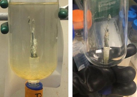 These sulfide lab chimneys are very fragile and oxygen-sensitive and thus can be challenging to handle. They fall apart easily if the experiment is perturbed, and if we try to remove the ocean the chimney often collapses so it can't be collected as easily for analysis. This is why we have developed various other methods of forming chimney precipitates in gradients for study of the mineralogy and reactivity of the solids: including "fuel cell" experiments that form the chimney as a flat membrane (publication), and "scaffolds" where the chimney is grown inside a structural support (publication).