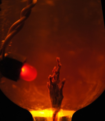 Vents are electrochemical systems since they contain gradients between hydrothermal fluids and seawater that can generate electrical potential (voltage). We can measure the voltage generated in our artificial vents by growing the chimney around a wire, and placing another wire in the ocean simulant. Then as the chimney grows it generates an electrical potential that we can measure.