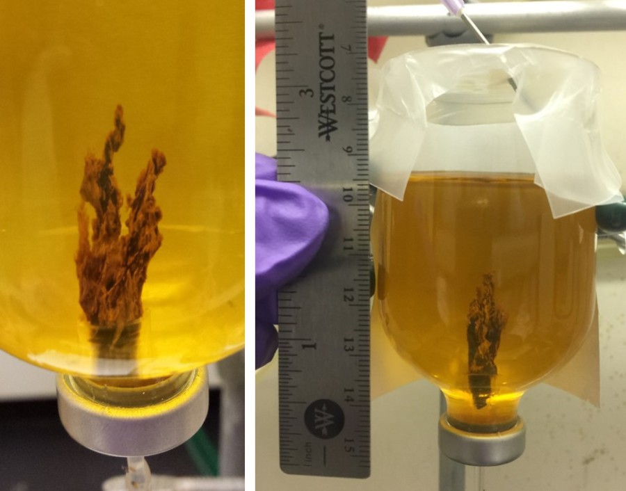 We grow these chimneys under a nitrogen atmosphere since iron is very redox sensitive, and we are simulating the early Earth's atmosphere before atmospheric oxygen. The hydrothermal fluid is alkaline and contains hydroxide (OH-) ions; the ocean simulant here contains a combination of ferrous and ferric chloride (Fe2+ and Fe3+). The slow injection of hydrothermal fluid into the ocean simulant with a syringe pump causes the formation of the chimney over several hours.