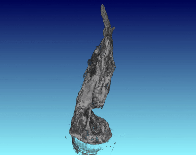 We have studied the 3D and interior structure of our lab-grown hydrothermal chimneys using X-ray CT scanning. This was done by growing an iron hydroxide chimney as above, then removing the ocean simulant and encasing the chimney in resin.